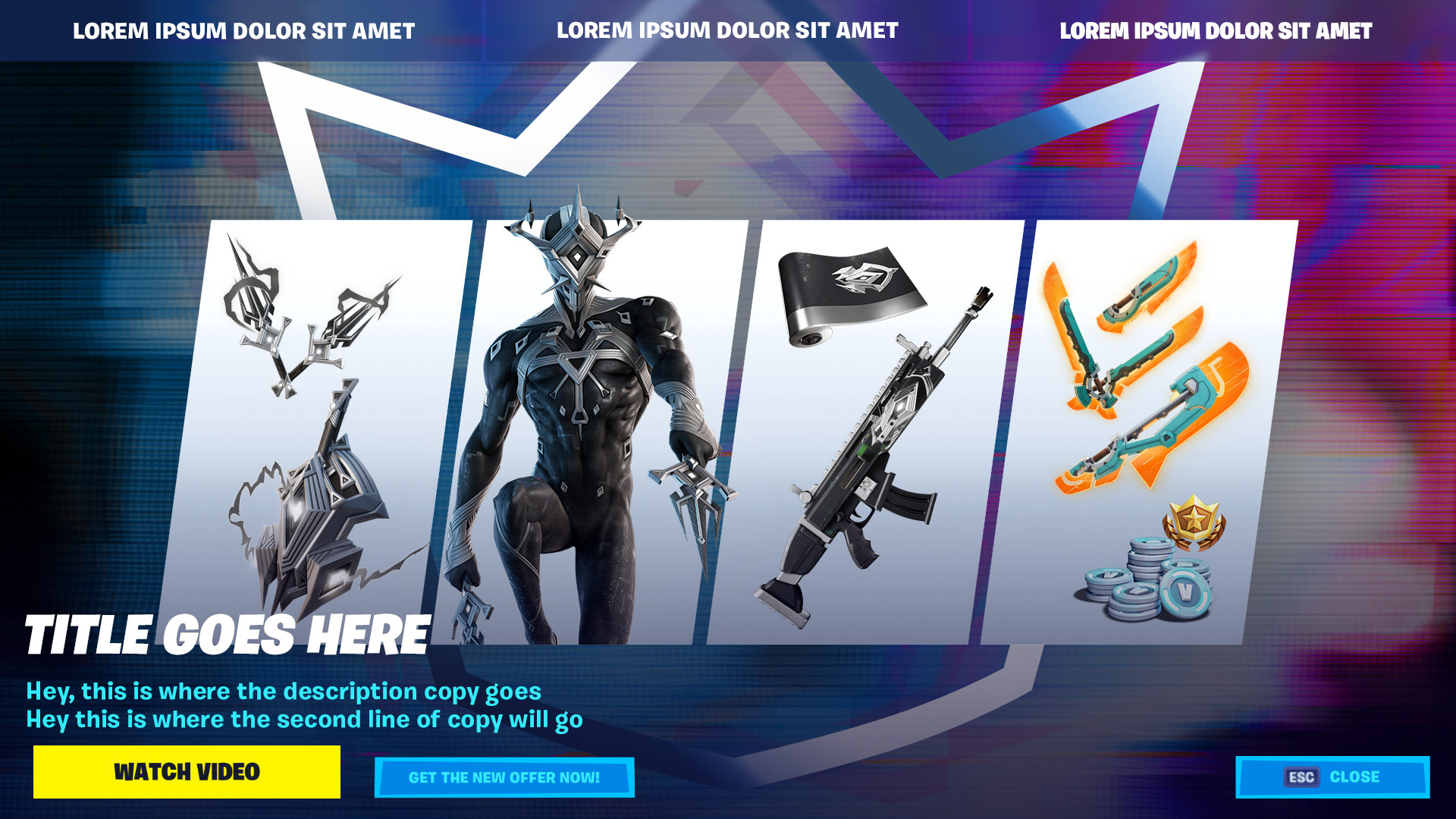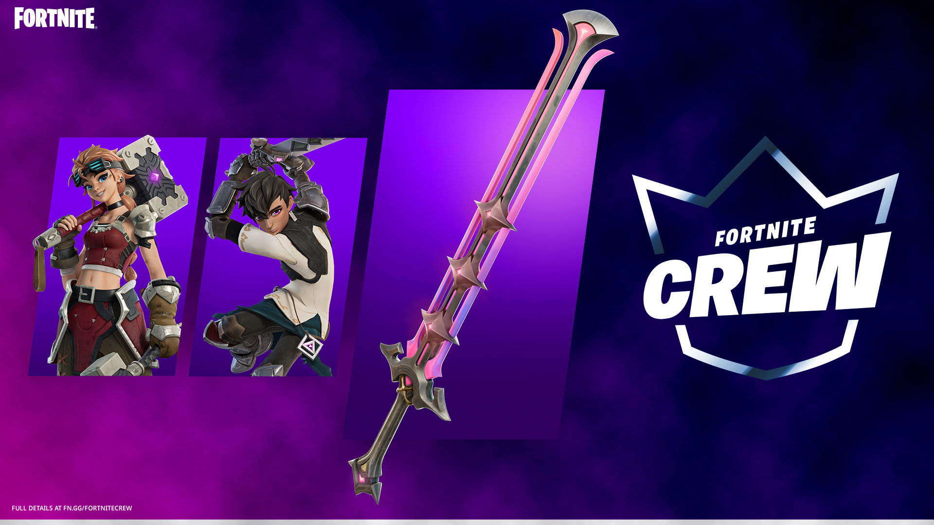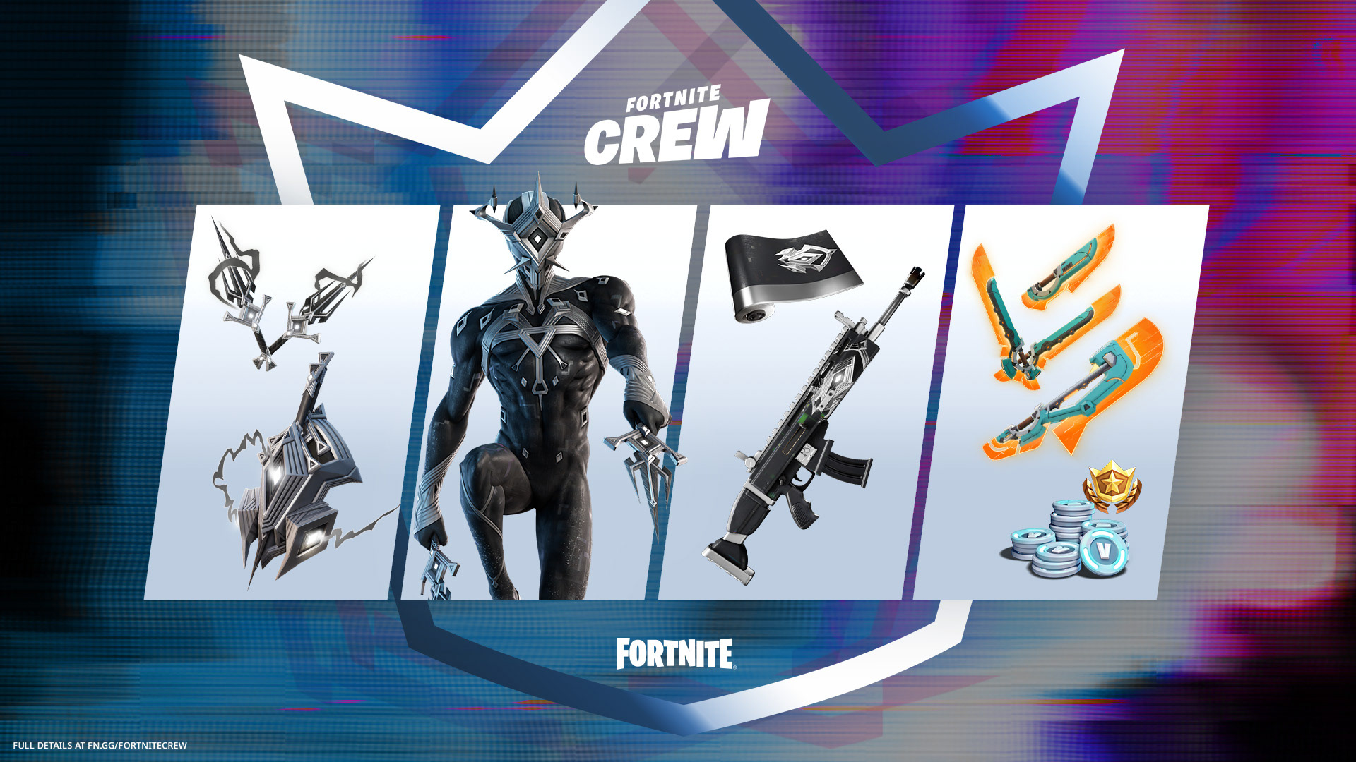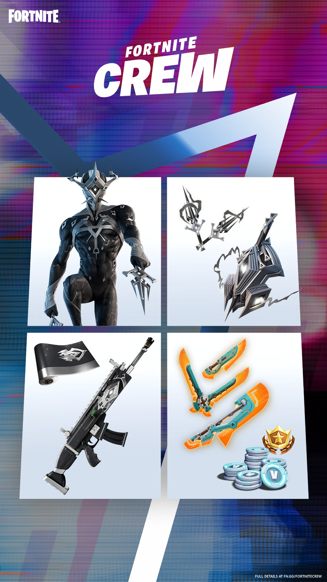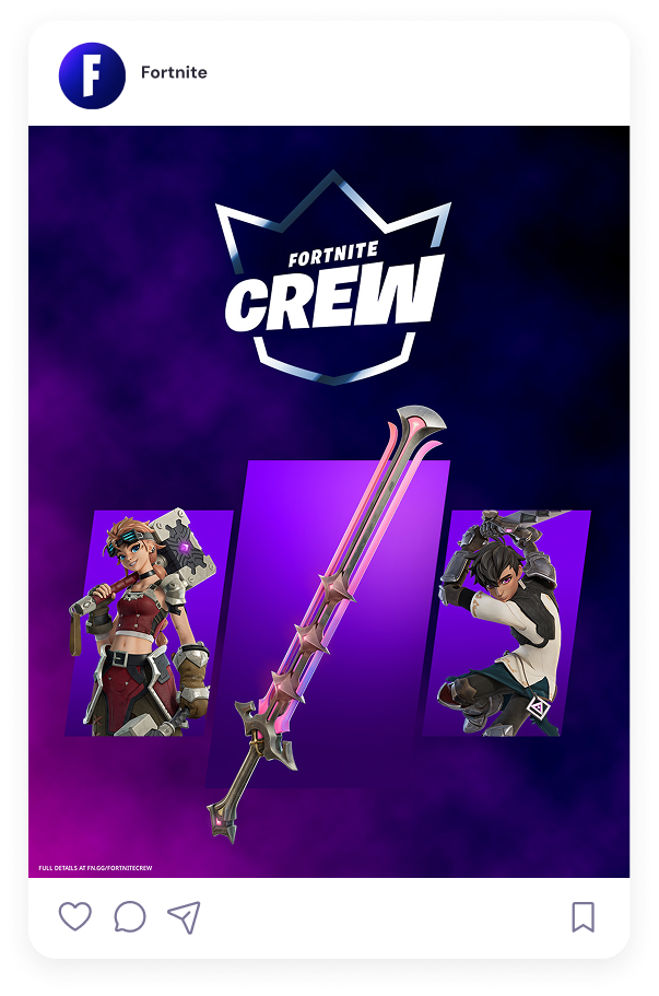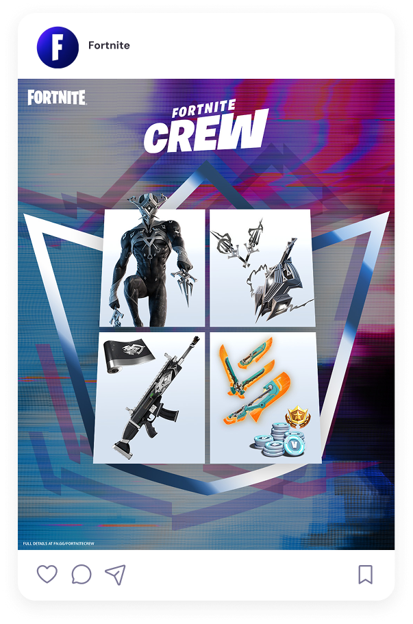 We worked with Epic Games to come up with designs and layouts for Fortnite Crew packs. These were skins, weapons, and items given monthly to players who subscribe to Fortnite Crew. The assets were designed and localized to countries around the world.